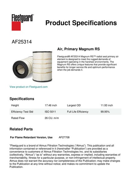 Fleetguard® AF25314 Magnum RS™ radial seal primary air element is designed to meet the rugged demands of equipment operating in the harshest environments. The Magnum RS offers unique features that provide significant benefits for longer service life and optimum performance when the job demands it.Specification