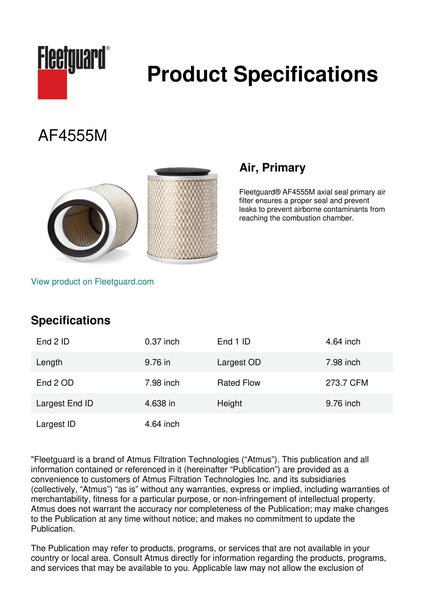 Fleetguard® AF4555M axial seal primary air filter ensures a proper seal and prevent leaks to prevent airborne contaminants from reaching the combustion chamber.