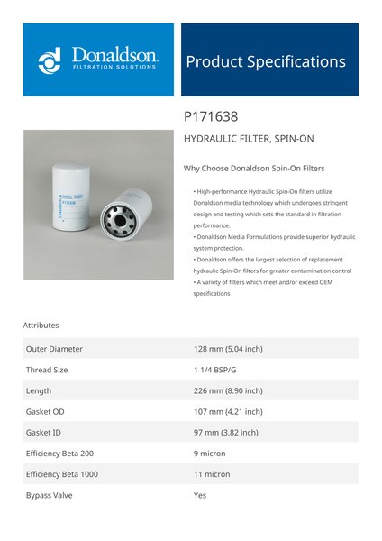 Genuine Donaldson P171638 Hydraulic Filter, Spin-On provides dependable protection for hydraulic systems by efficiently removing particulates and contaminants. It ensures clean hydraulic fluid, promoting smooth operation and extending the lifespan of critical system components.With its easy-to-install spin-on design, this filter minimizes downtime and maintenance costs. Its durable construction and advanced filtration media make it a trusted choice for industrial and mobile hydraulic applications requiring reliable performance.