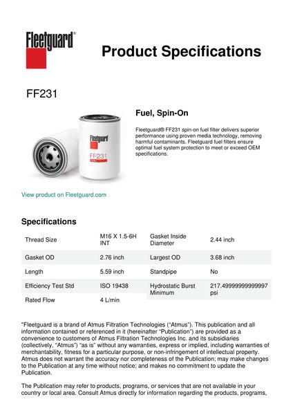 Fleetguard® FF231 spin-on fuel filter delivers superior performance using proven media technology, removing harmful contaminants. Fleetguard fuel filters ensure optimal fuel system protection to meet or exceed OEM specifications.Specification