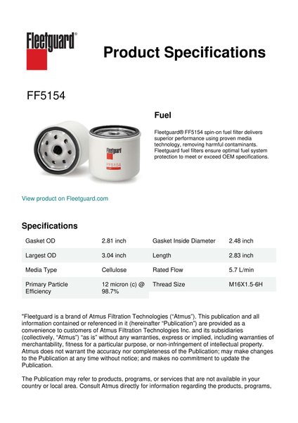 Fleetguard® FF5154 spin-on fuel filter delivers superior performance using proven media technology, removing harmful contaminants. Fleetguard fuel filters ensure optimal fuel system protection to meet or exceed OEM specifications.Specification