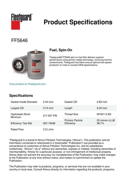 Fleetguard® FF5646 spin-on fuel filter delivers superior performance using proven media technology, removing harmful contaminants. Fleetguard fuel filters ensure optimal fuel system protection to meet or exceed OEM specifications.Specification