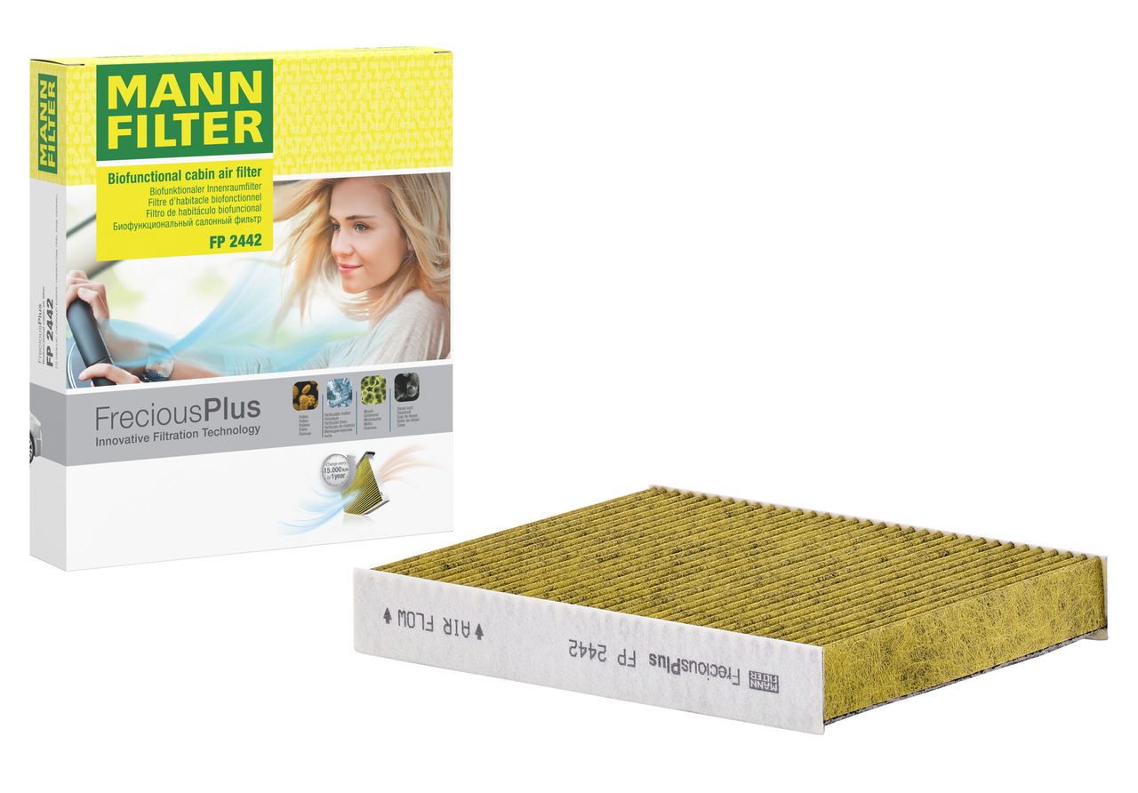 Biofunctional MANN-FILTER FreciousPlus cabin air filters - nearly 100% protection against nitrogen oxides, dust, allergens and mould - harmful gases and unpleasant odours are also eliminated and virus aerosols filtered. The three-layer filter technology absorbs almost 100% of allergens, reduces the growth of molds and bacteria by more than 98% and stops fine dust almost completely.Specification
