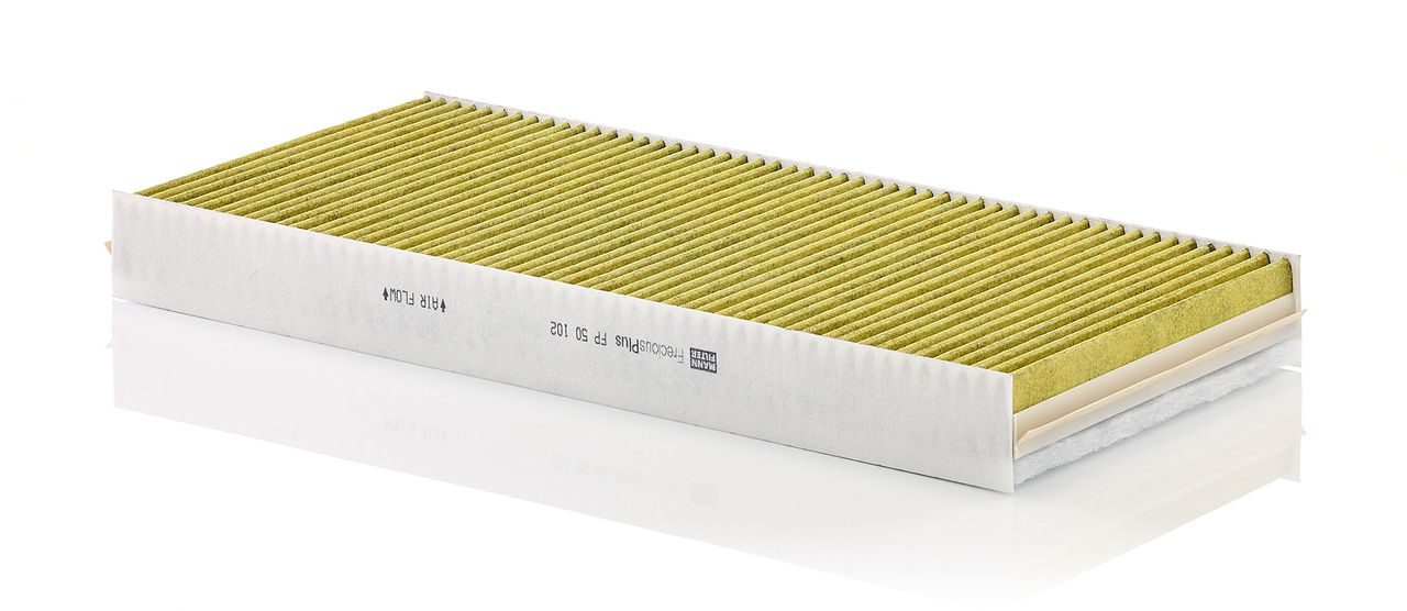 Biofunctional MANN-FILTER FreciousPlus cabin air filters - nearly 100% protection against nitrogen oxides, dust, allergens and mould - harmful gases and unpleasant odours are also eliminated and virus aerosols filtered. The three-layer filter technology absorbs almost 100% of allergens, reduces the growth of molds and bacteria by more than 98% and stops fine dust almost completely.Specification