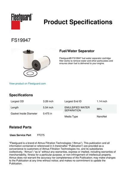 Fleetguard® FS19947 fuel water separator cartridge filter works to remove water and other particulates and ensures clean fuel is delivered to your engine.Specification