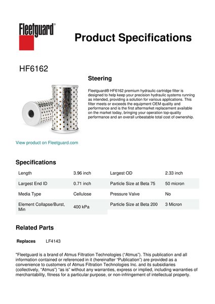 Fleetguard® HF6162 premium hydraulic cartridge filter is designed to help keep your precision hydraulic systems running as intended, providing a solution for various applications. This filter meets or exceeds the equipment OEM quality and performance and is the first aftermarket replacement available on the market today, bringing your operation top-quality performance and an overall unbeatable total cost of ownership.Specification