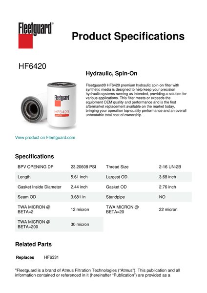 Fleetguard® HF6420 premium hydraulic spin-on filter with synthetic media is designed to help keep your precision hydraulic systems running as intended, providing a solution for various applications. This filter meets or exceeds the equipment OEM quality and performance and is the first aftermarket replacement available on the market today, bringing your operation top-quality performance and an overall unbeatable total cost of ownership.Specification