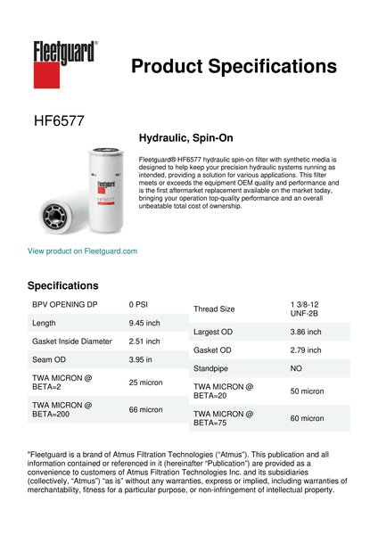 Fleetguard® HF6577 hydraulic spin-on filter with synthetic media is designed to help keep your precision hydraulic systems running as intended, providing a solution for various applications. This filter meets or exceeds the equipment OEM quality and performance and is the first aftermarket replacement available on the market today, bringing your operation top-quality performance and an overall unbeatable total cost of ownership.Specification