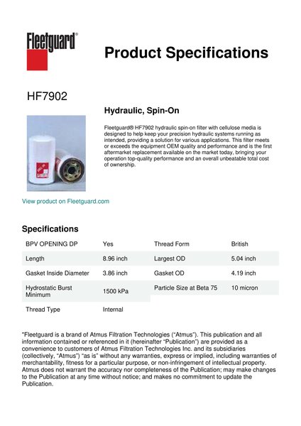 Fleetguard® HF7902 hydraulic spin-on filter with cellulose media is designed to help keep your precision hydraulic systems running as intended, providing a solution for various applications. This filter meets or exceeds the equipment OEM quality and performance and is the first aftermarket replacement available on the market today, bringing your operation top-quality performance and an overall unbeatable total cost of ownership.Specification