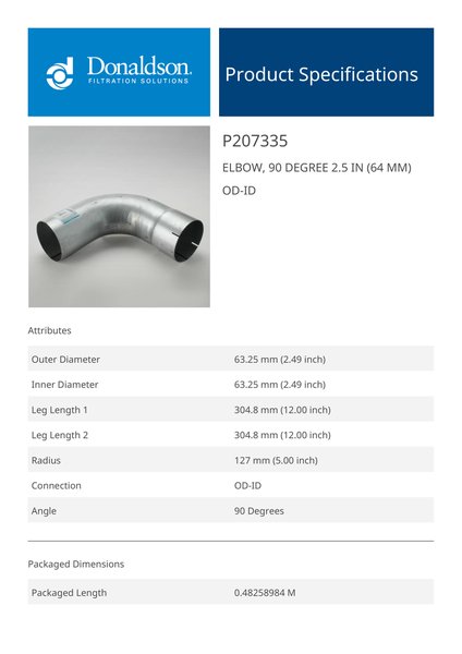 Genuine Donaldson P207335 Elbow, 90 Degree 2.5 In (64 Mm) Od-Id is engineered to deliver reliable performance and durability across a wide range of applications. Designed with high-quality materials, it ensures consistent functionality while meeting demanding operational requirements.