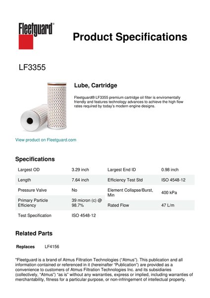 Fleetguard® LF3355 premium cartridge oil filter is enviromentally friendly and features technology advances to achieve the high flow rates required by today’s modern engine designs.Specification