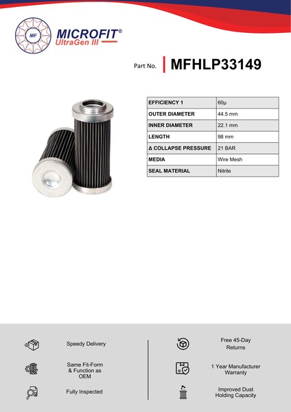 The efficiency of the element is shown using the Micron (µ) and Beta (β) ratings. The micron rating indicates the size of the particle being filtered and the beta rating the efficiency, calculated as 1/β.
